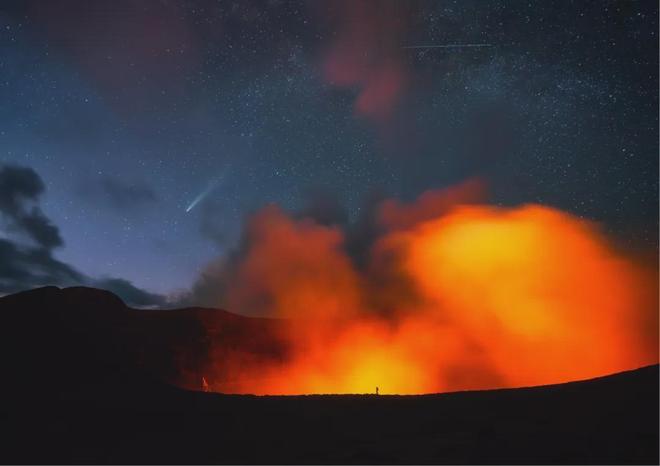 2024年10月21日摄于瓦努阿图。在Yasur火山脚下的树屋住了了一周,第六次攀登火山时中终遇晴天,也正赶上紫金山彗星抵达近地点,于是记录下了我与火山、彗星共同出镜的珍贵时刻,在Yasur火山拍摄夜景及其困难,这或许是历史上首次有人在这个位置拍摄到彗星。
